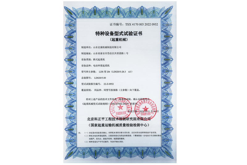 电动单梁桥式起重机型式试验合格证