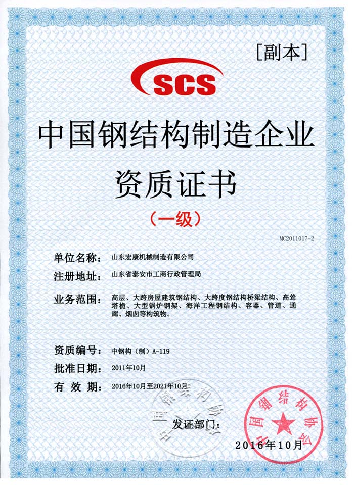 中国钢结构制造企业资质证书
