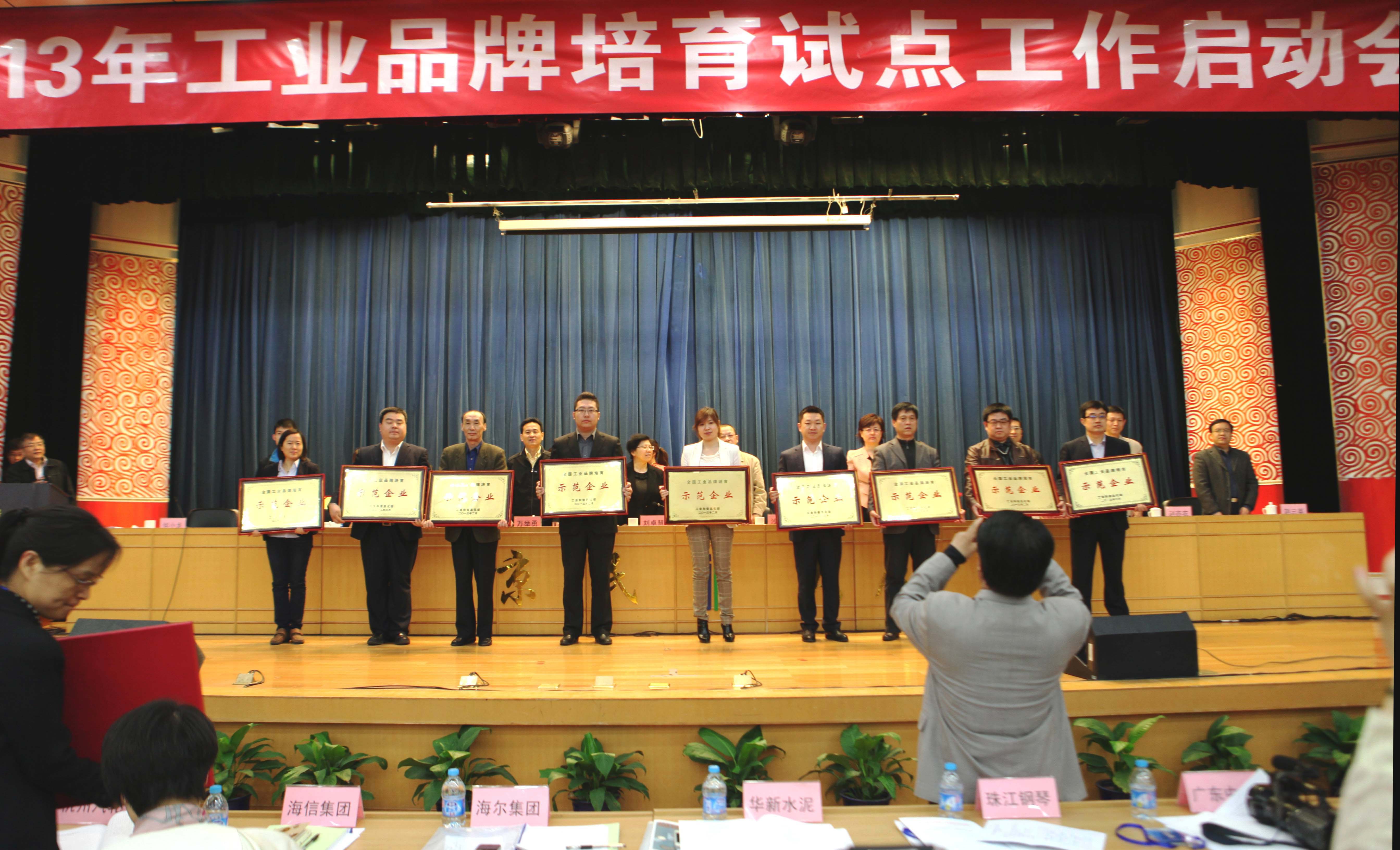 4月25日,由国家工信部科技司组织的2013年工业品牌培育试点工作启动会暨2012年工业品牌培育示范企业表彰大会在北京召开。会议总结了2012年工作成绩,为36家品牌培育示范企业授牌,并部署开展2013年的工作。来自全国工信主管部门及有关单位、协会和企业的近500位专家和代表出席会议。集团公司成为锻压机械行业唯一一家获得工信部“2012年工业品牌培育示范企业”荣誉称号的企业,受集团董事长、总经理康凤明委托,常务副总经理潘宪平代表集团参加会议并上台领取授牌。