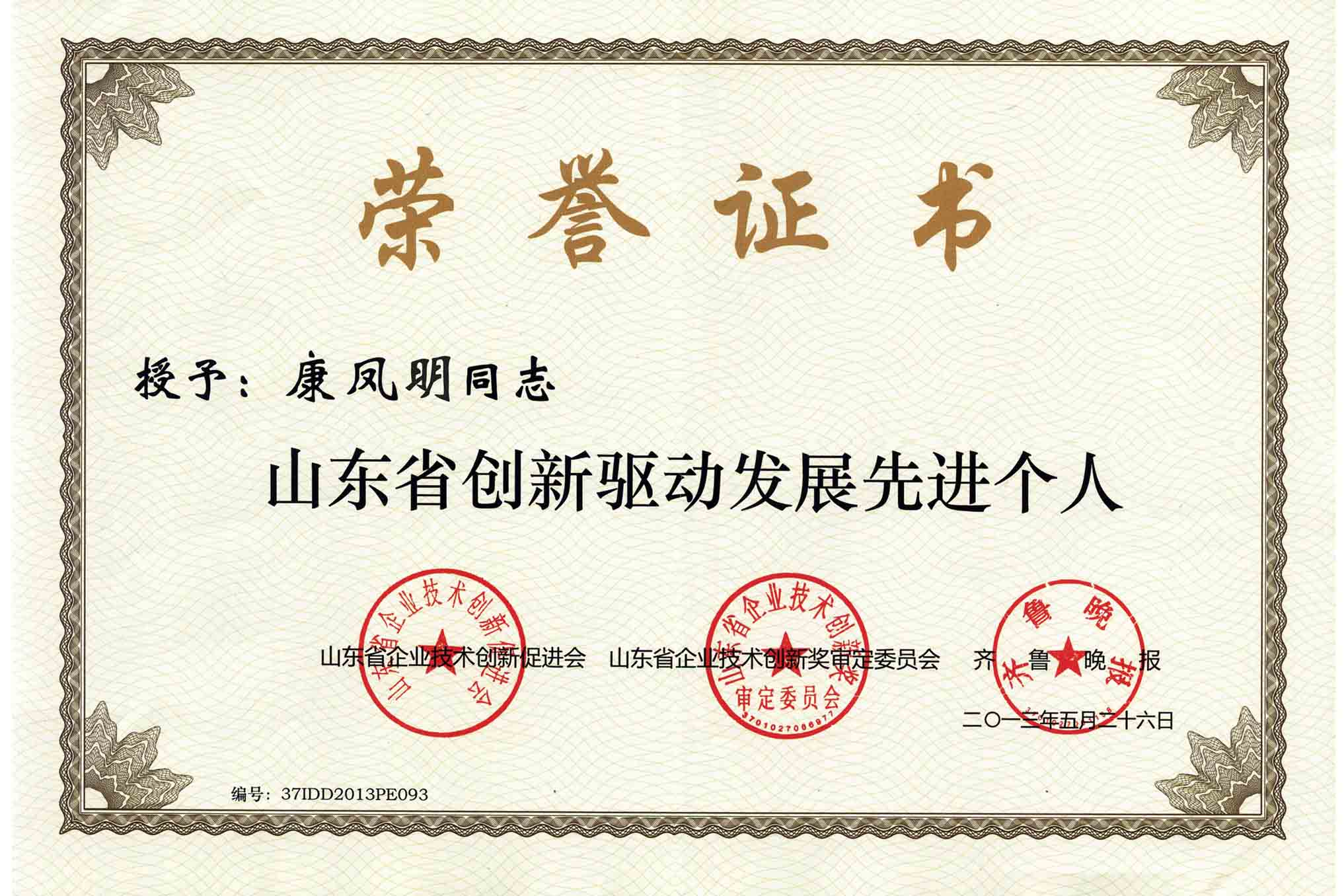 日前,据山东省企业技术创新促进会鲁创促字【2013】9号文件《关于表彰全省企业技术创新能力建设工作百强企业和先进单位个人的通报》,我集团公司被评为“山东省创新驱动发展先进单位”,董事长、总经理康凤明被授予“山东省创新驱动发展先进个人”。