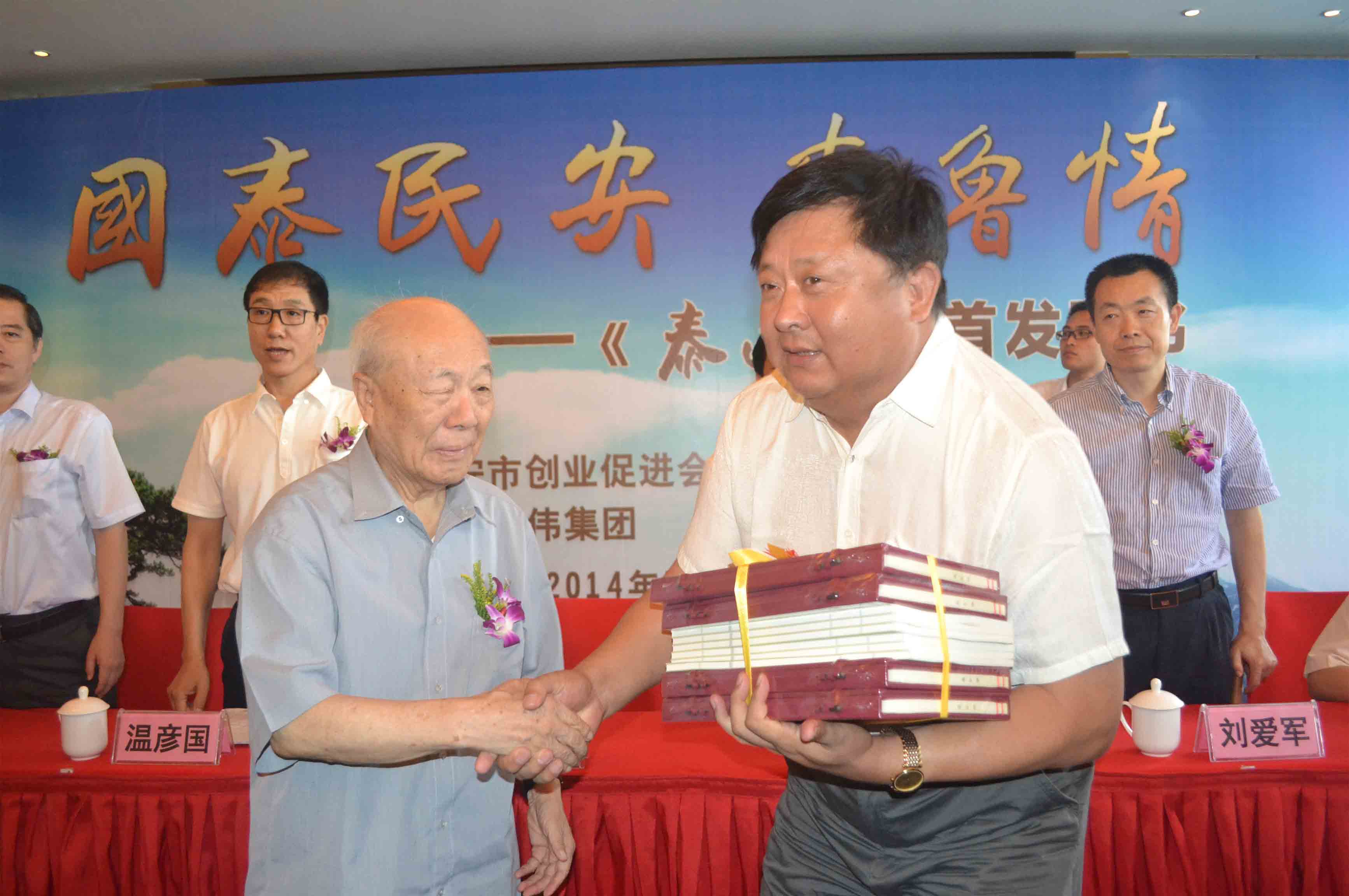 7月18日上午,“国泰民安·齐鲁情”著名书法家欧阳中石先生《泰山颂》首发赠书仪式在泰安宝龙福朋大酒店举行。董事长、总经理康凤明应邀参加仪式,代表宏康集团上台接受欧阳中石先生赠书并合影留念。 欧阳中石先生是全国政协委员、中央文史研究馆